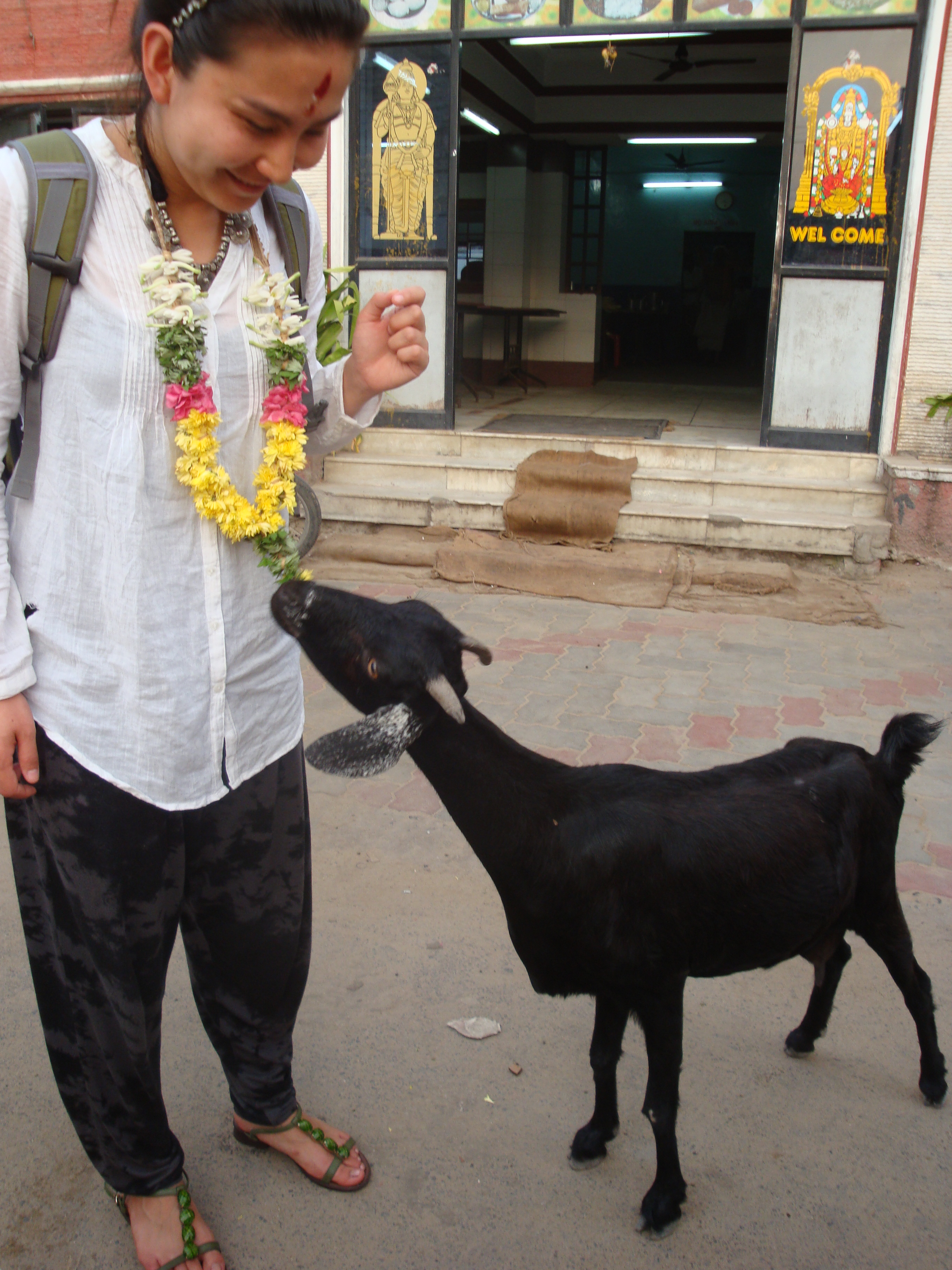 The most memorable part of my temple visit was sitting down at the the entrance of the center shrine with Neeraja and Sita. The priests received our names and prayers, he walked right inside the room brought our offerings to the god Shiva. Neeraja said she prayed for my marriage and my brother find a good job. The priest brought a garland from the inside of the temple to me and put around my neck. I felt really humble and had tears in my eye. It was definitely a special moment for me to be accepted and treated as the same. When we walked out, the goat and cows outside the temple came to me start eating my garland. I decided to leave the flower to the goat, it needs the flower more than I do.