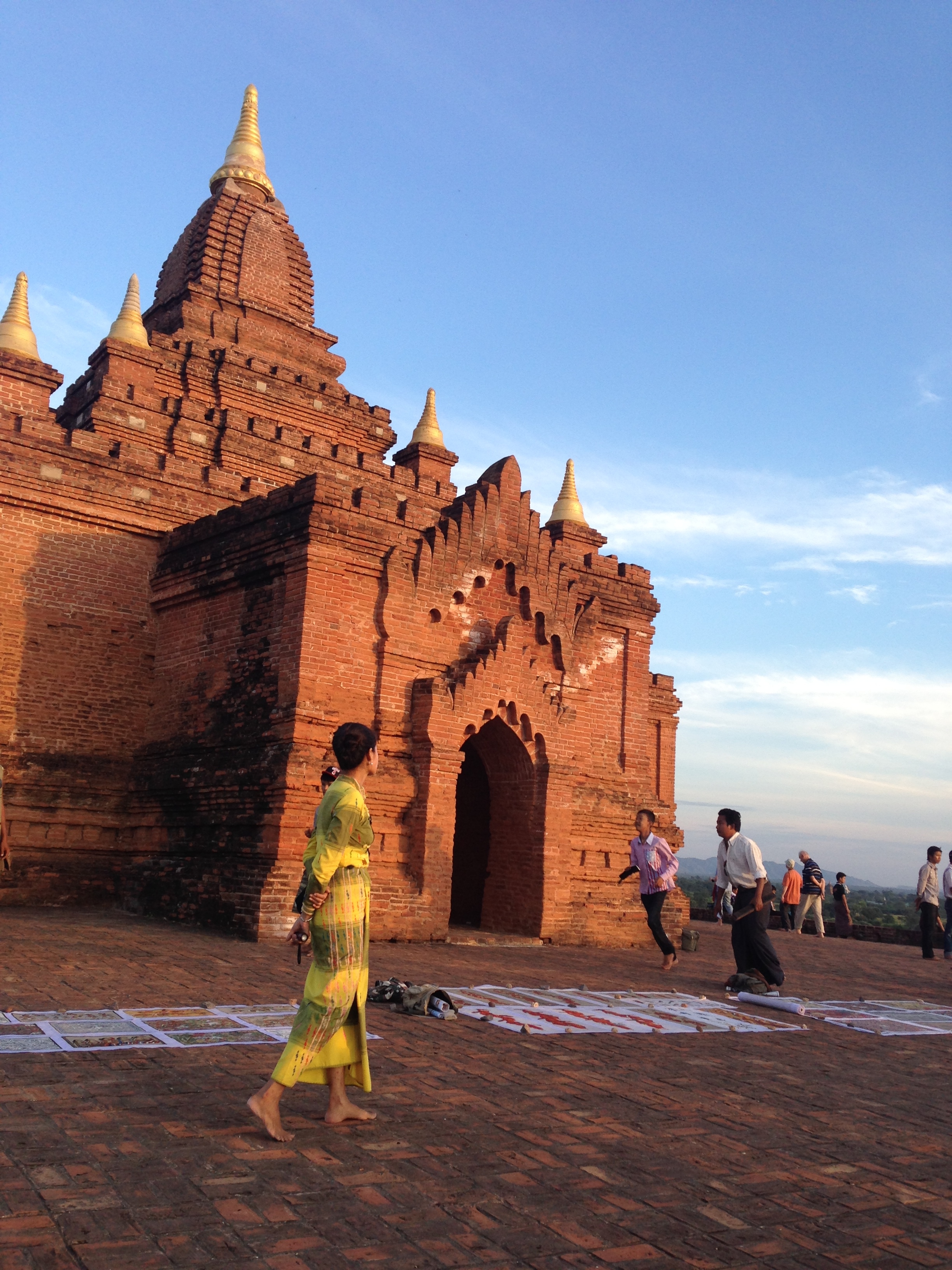 The next day we biked around the new Bagan area . A local young man stopped us and told us about the sand paintings drawn by his father . After a bit of haggling we bought a small piece with 7000 chit . Later on when we went to the temples turned out to be many many more people who were selling the identical paintings also “done” by their parents or grand parents . The village we come across on the bike trip are really poor . People lived in a very simple hut with grass made roof which is pretty much all they own .