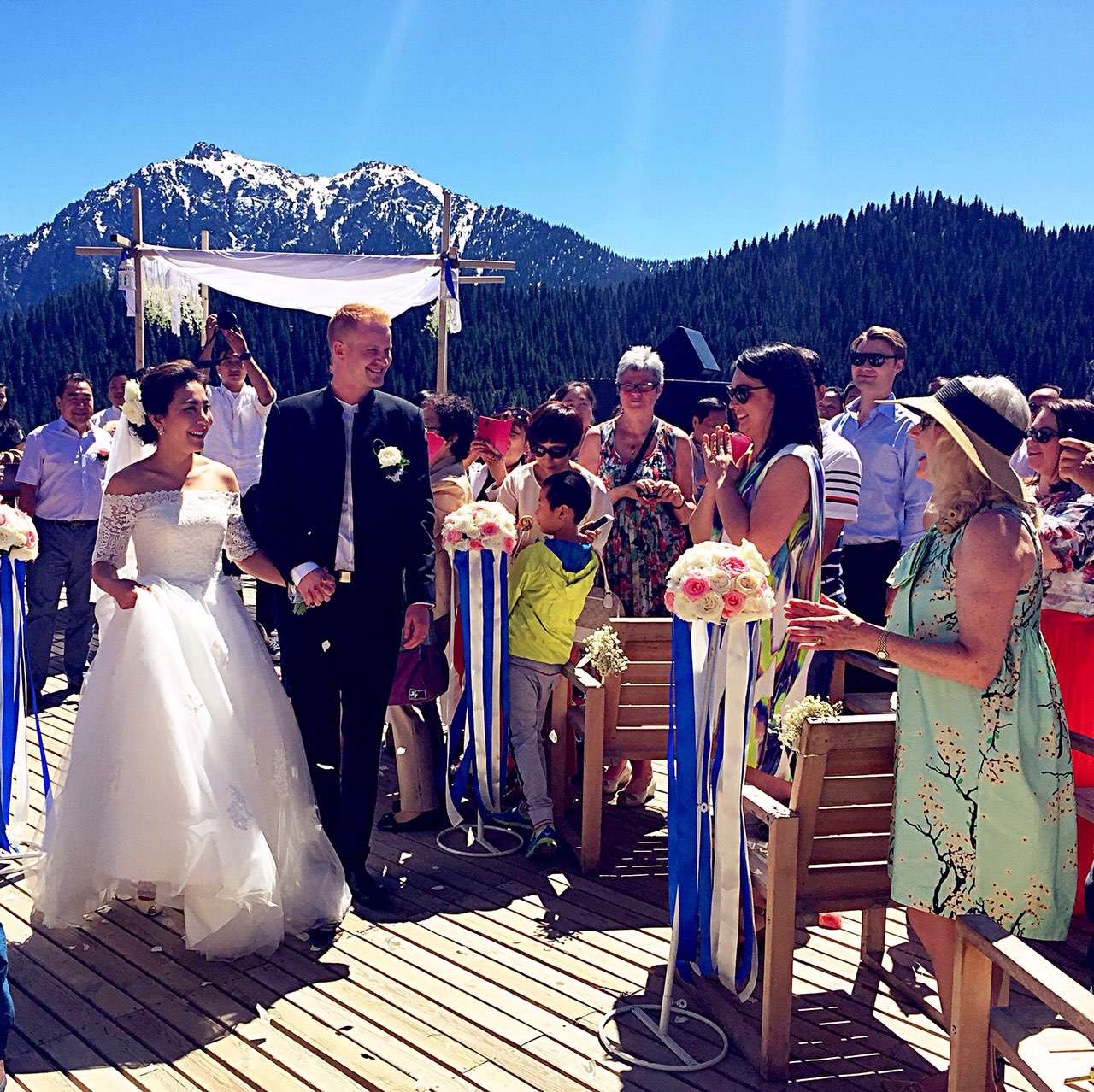 We always knew the biggest challenge of this wedding would be the logistics. We arranged three buses and four 4 x wheel drives to take guests from city to the venues. The bus can only reach the bottom of the ski resort, to take people up we planned to rely on the 4xwheel drives. It turned out to be a “daymare”, due to lack of communication between the wedding planner and the drivers, those 4xwheel drivers did not even take half of the guests up the hill. The drivers went on strike after 5 return trips, they complained the hill was too steep and their cars were not equipped to make many trips. So many of our guests had to walk up to the wedding venue, the climb was steep and it took an hour to reach. My brother Lichen was with some of the guests from New Zealand climbing up the mountain. Half way through the ascend he called me while I was sitting in my dressing room on top of the mountain. Lichen told me with great concern that it was too hot and some guests were about to faint, please have water ready on stand by at the top of the hill.